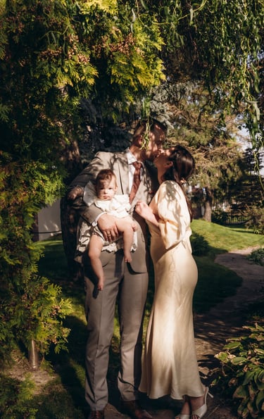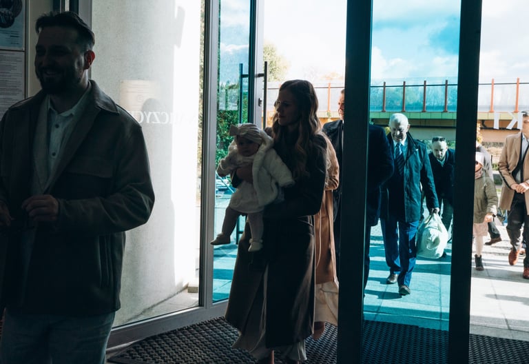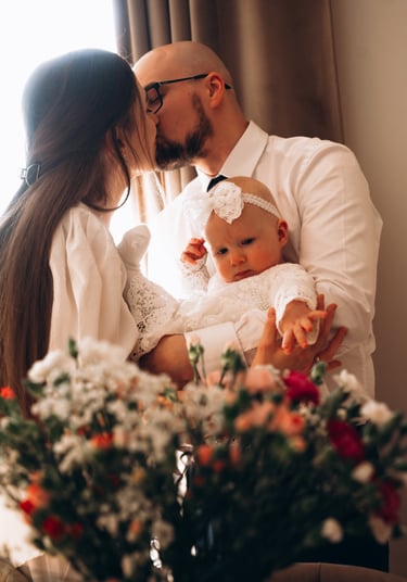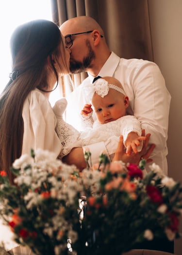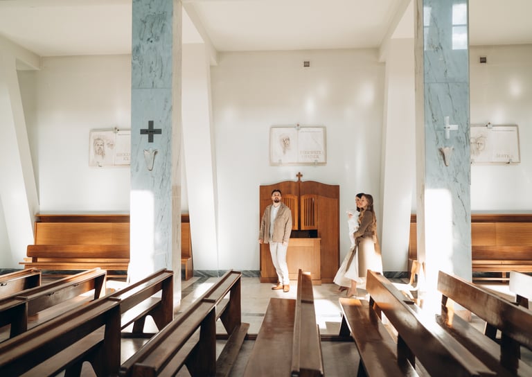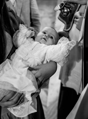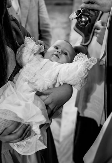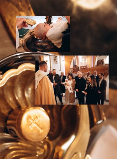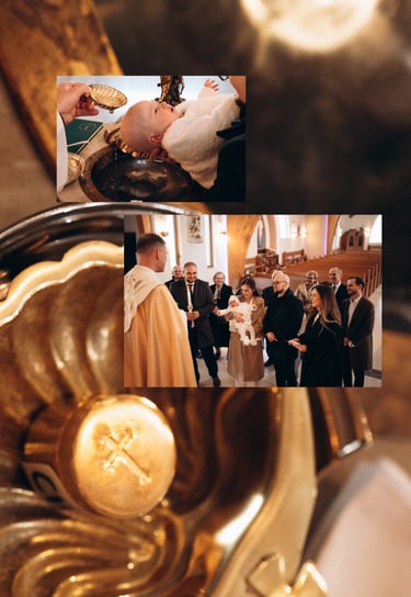 Reportaż z ceremonii chrztu świętego oraz rodzinne zdjęcia po mszy, przy ołtarzu, przed kościołem lub w jego okolicy.